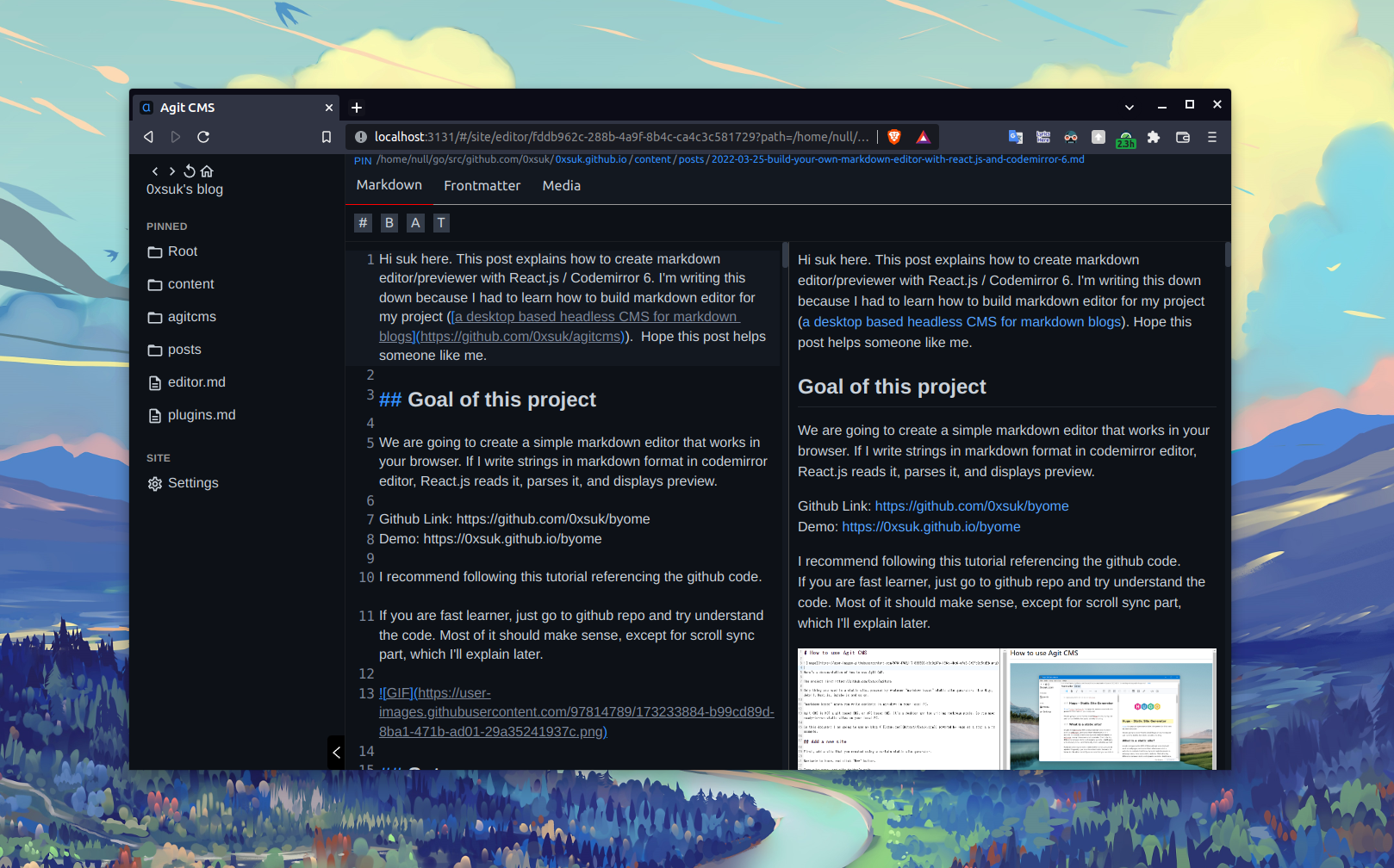 Agit CMS is a simple web frontend interface that utilizes filesystem to manage markdown/media contents. Built for markdown-based static site generators, like Hugo and Jekyll. Write markdown blog posts the hackable way, get rid of your itch points.