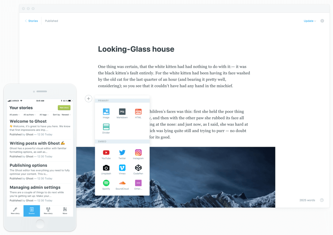 Ghost is an open source, professional publishing platform built on a modern Node.js technology stack — designed for teams who need power, flexibility and performance. Every day Ghost powers some of the most-read stories on the internet, serving hundreds of millions of requests across tens of thousands of sites.
